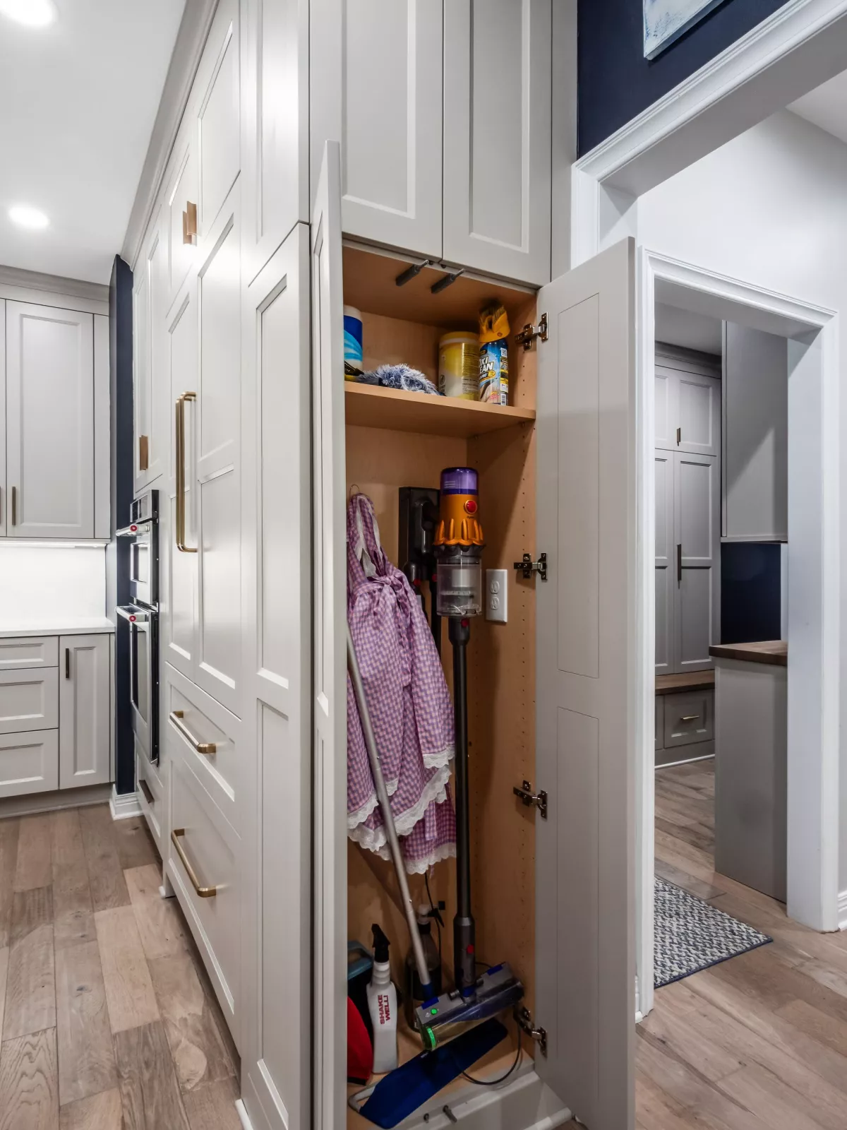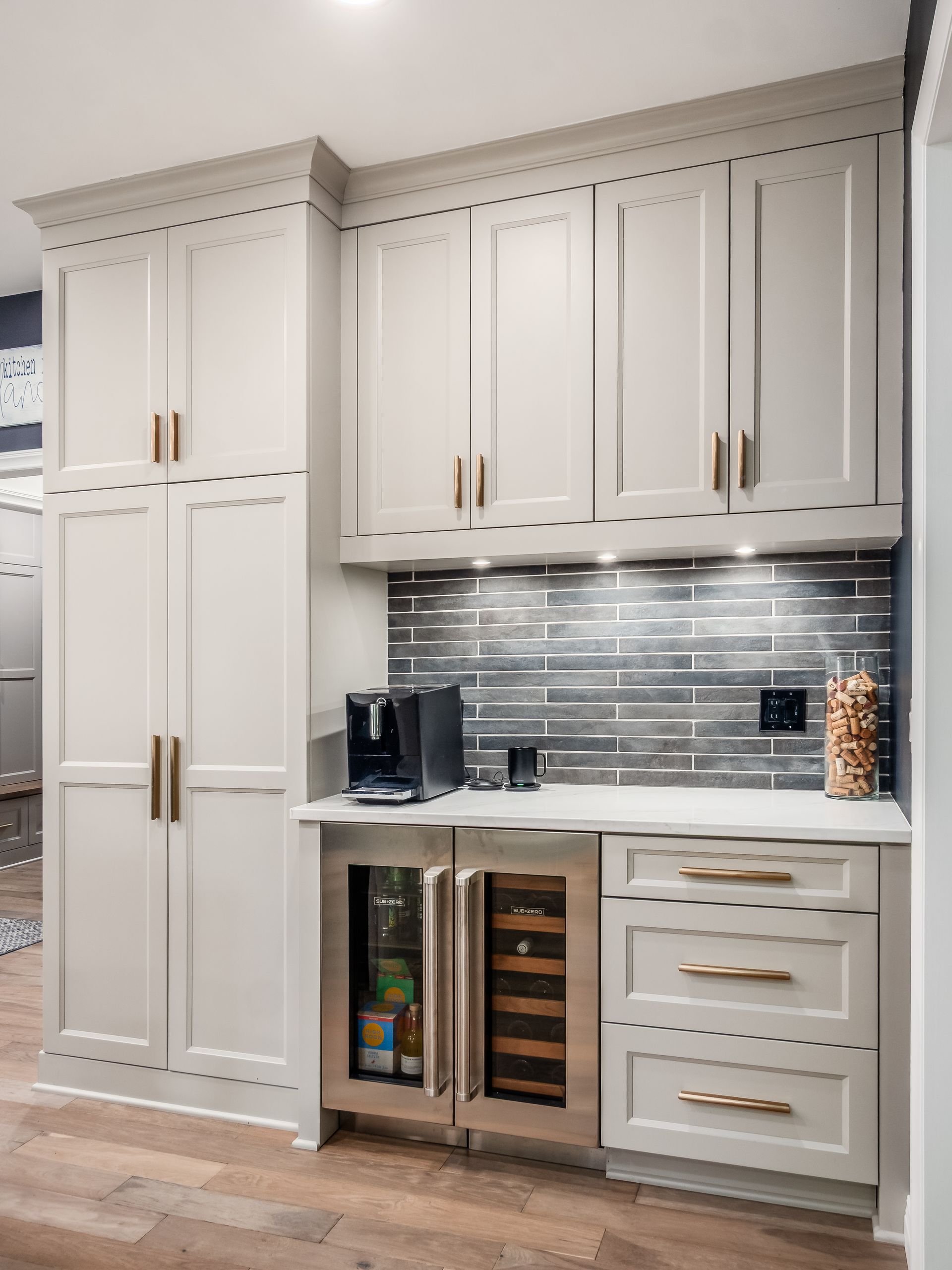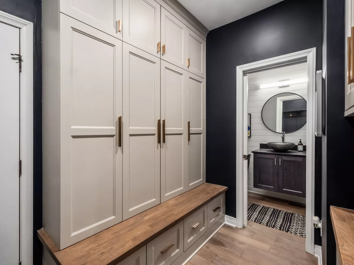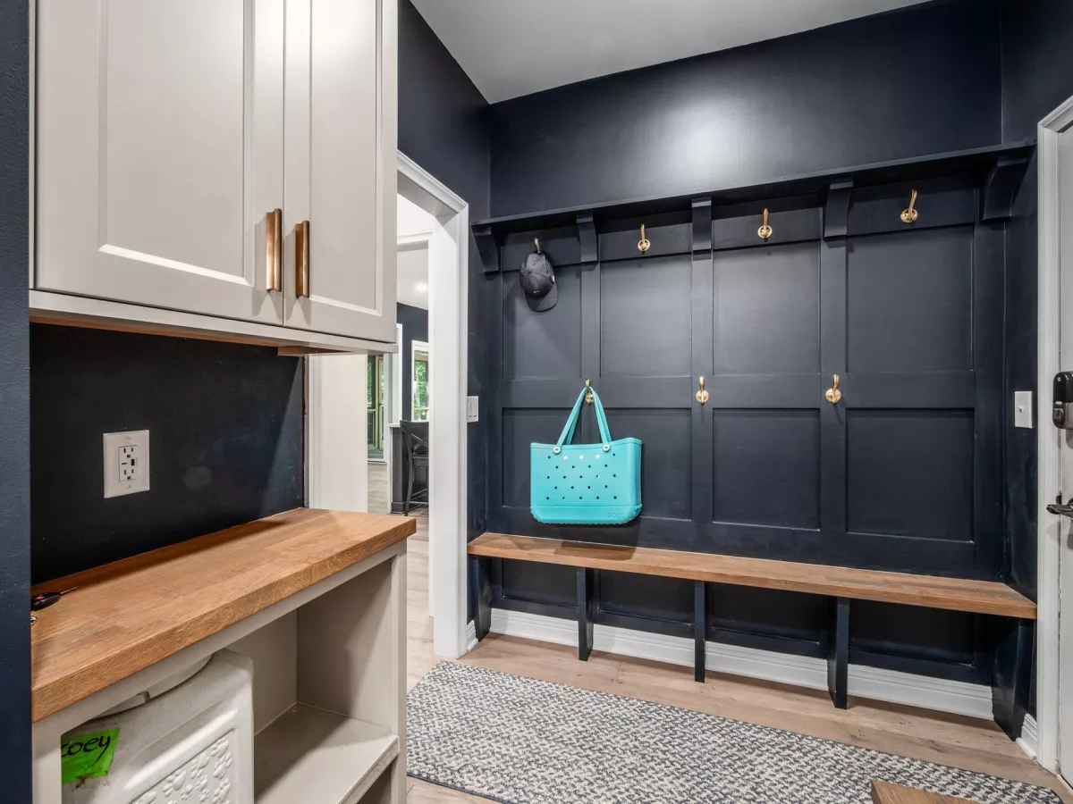 “This project was ambitious with the layout changes we made. We were able to convert a small, awkward kitchen with a tiny island into a generous space for family and friends to gather by relocating a powder bath to the previous laundry room location, while creating a separate mudroom off the garage entry. We then converted a closet in the upstairs hallway to a convenient laundry alcove. The project design and selections create a stunning impact for the new spaces, both in terms of beauty and function. It was such a pleasure putting this together for the family, and I hope they will enjoy it for many years to come!”