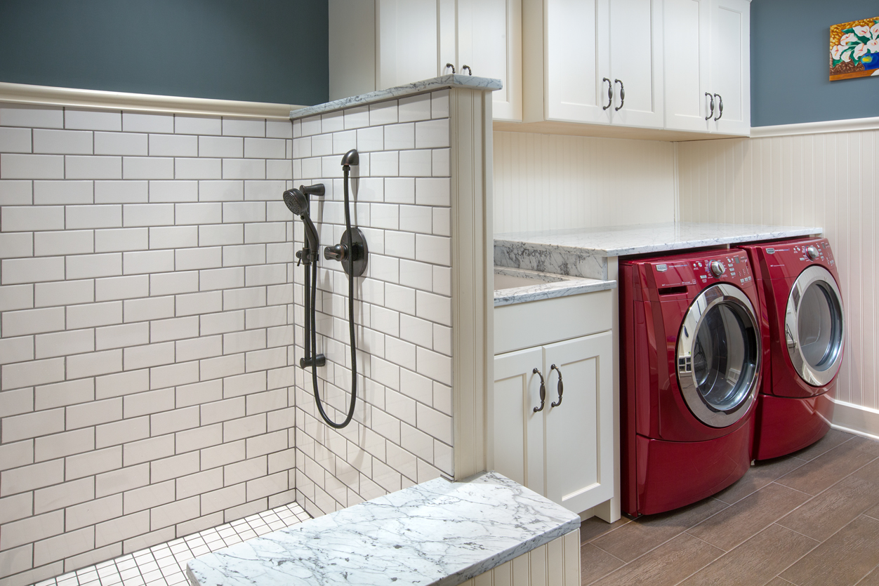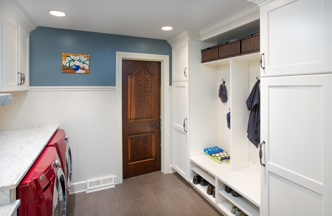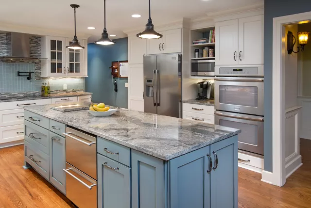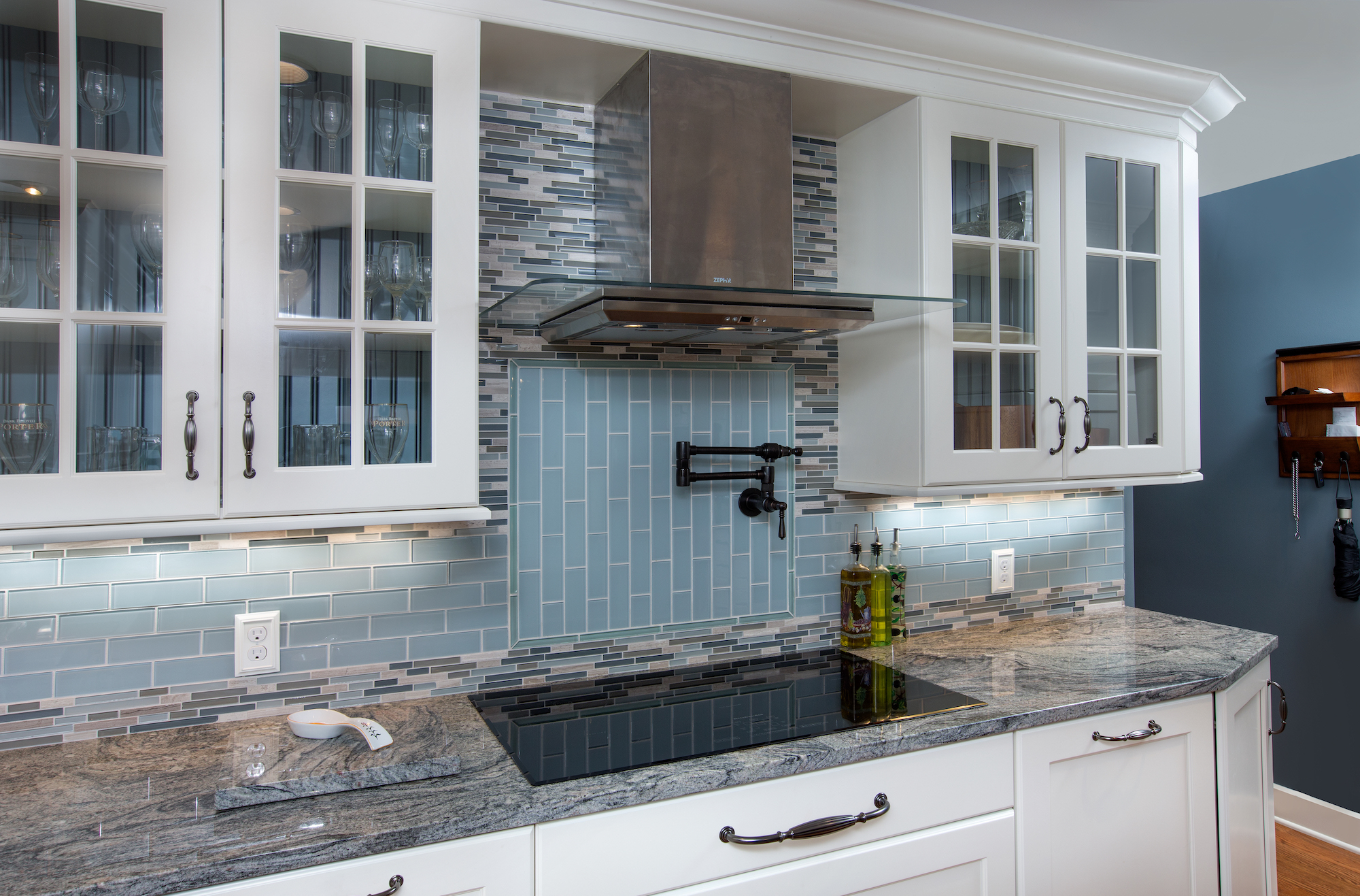 The painted cabinets were custom made by Grabill cabinets, and the island is a custom color match the client requested to match the blue glass in the modern tile backsplash. Lastly, graphite finished hardware provides the finishing touch on this modern, yet timeless kitchen design.