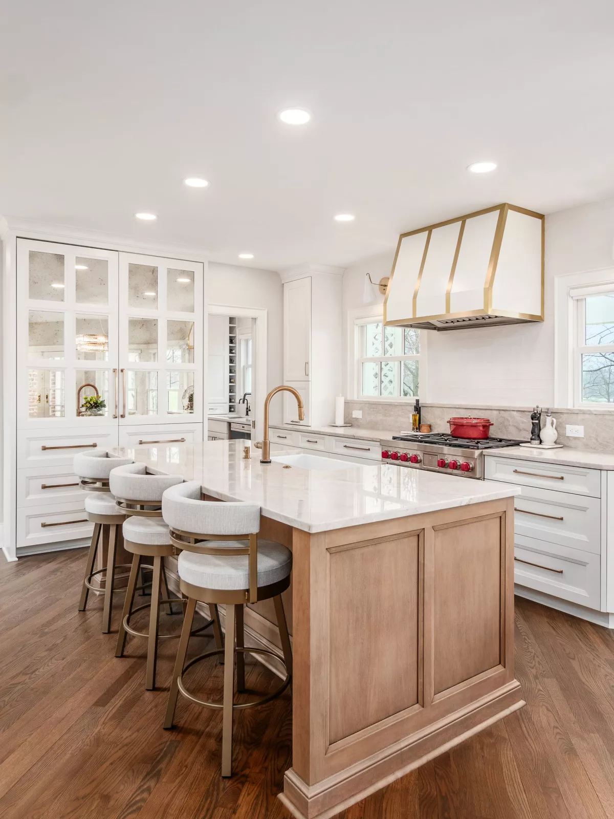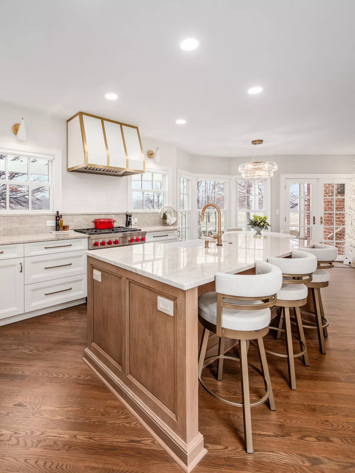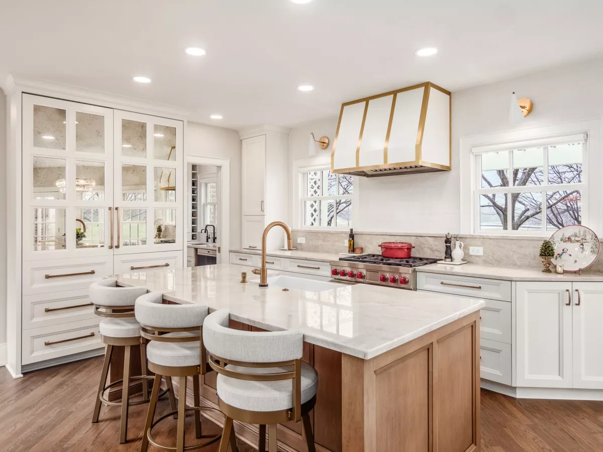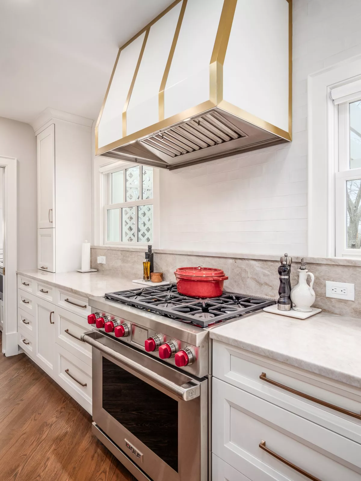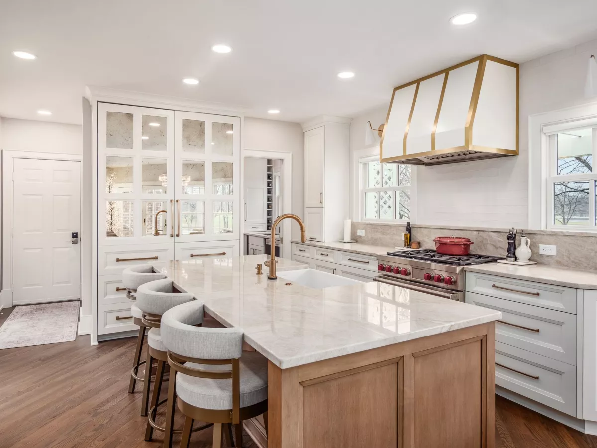 This stunning kitchen remodel showcases the perfect combination of luxury and functionality. At its heart are custom-crafted cabinets, designed to maximize storage while reflecting timeless sophistication. A striking custom hood with brass accents becomes the centerpiece of the kitchen, seamlessly tying together the aesthetic.