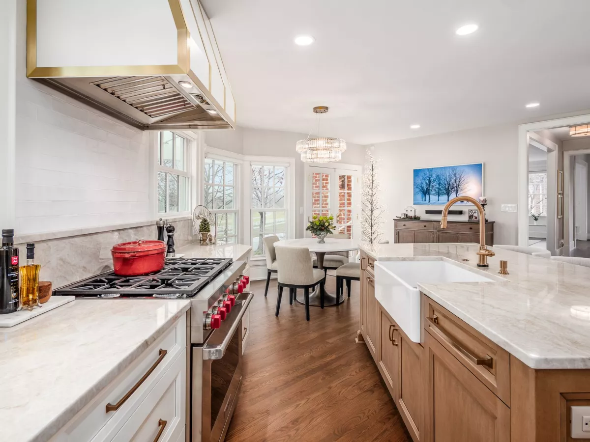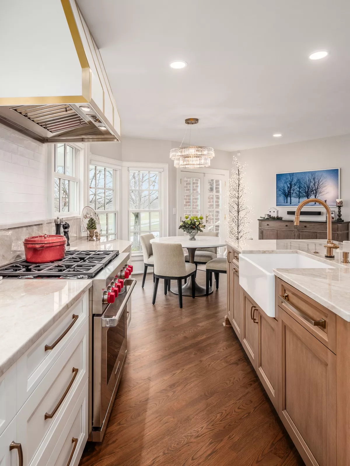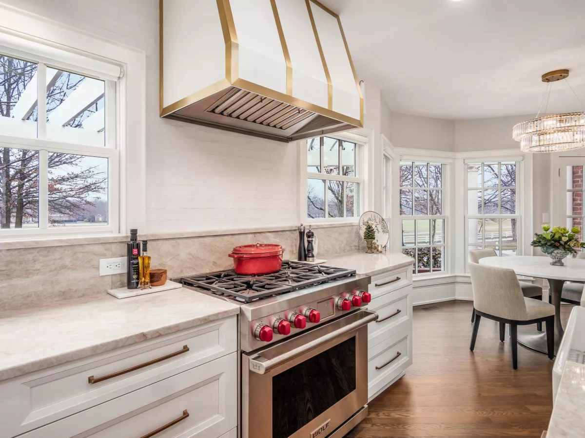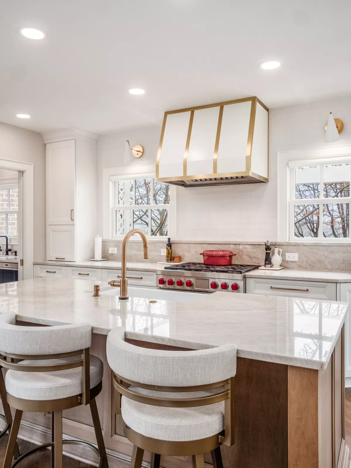 This stunning kitchen remodel showcases the perfect combination of luxury and functionality. At its heart are custom-crafted cabinets, designed to maximize storage while reflecting timeless sophistication. A striking custom hood with brass accents becomes the centerpiece of the kitchen, seamlessly tying together the aesthetic.