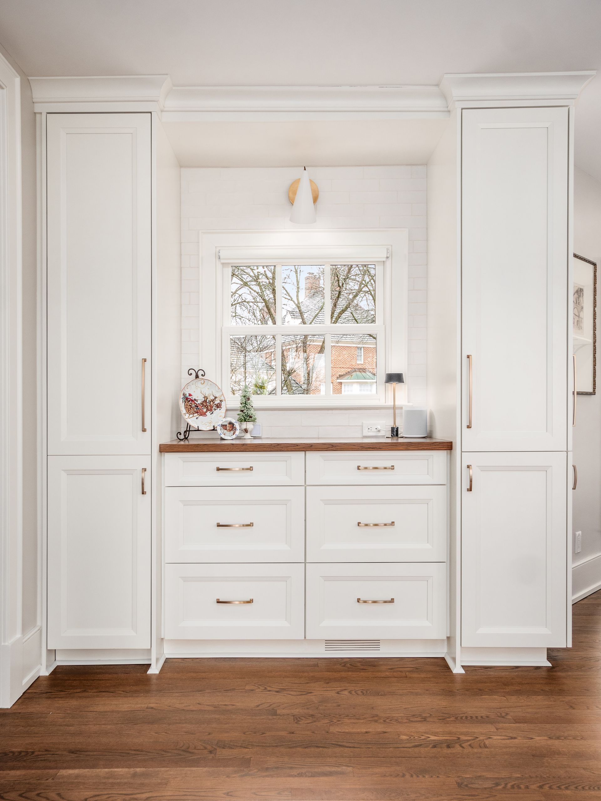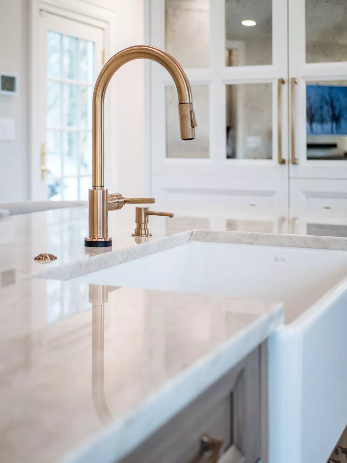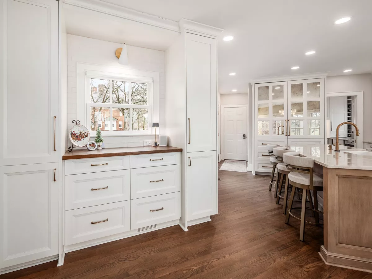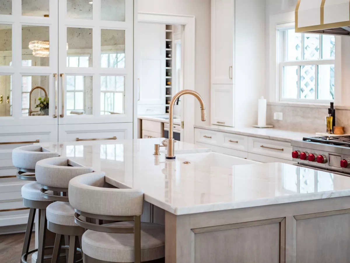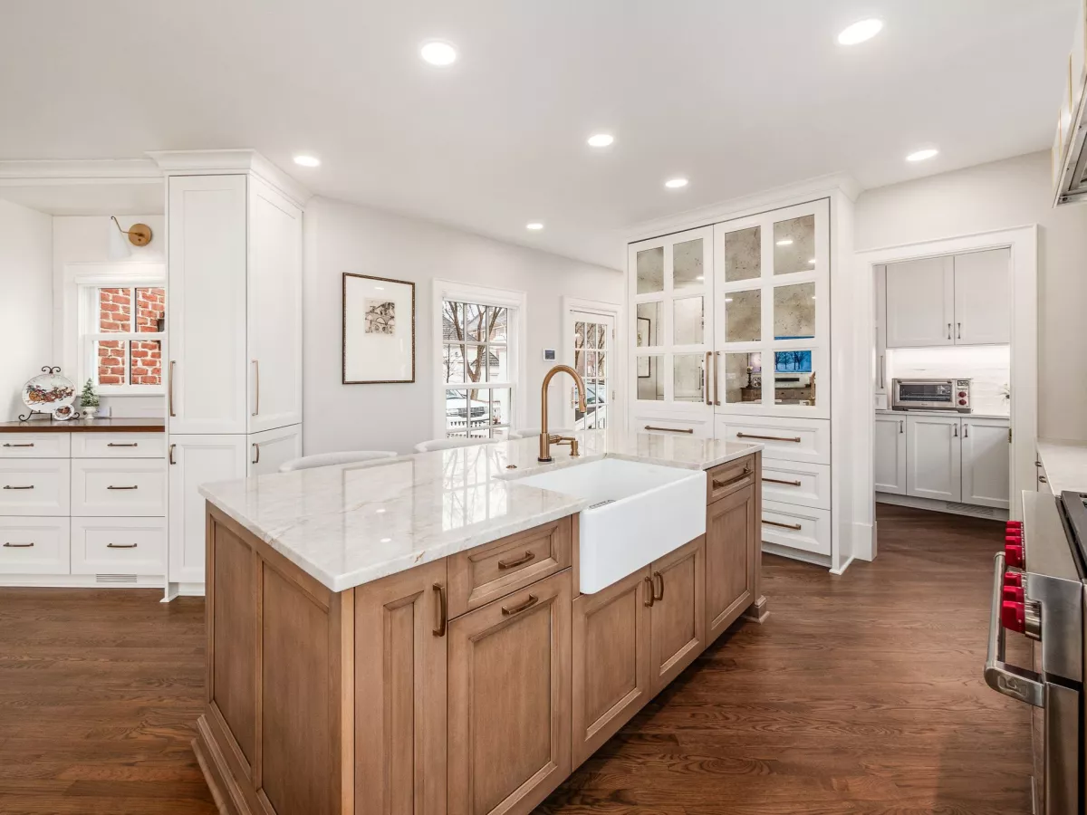 This stunning kitchen remodel showcases the perfect combination of luxury and functionality. At its heart are custom-crafted cabinets, designed to maximize storage while reflecting timeless sophistication. A striking custom hood with brass accents becomes the centerpiece of the kitchen, seamlessly tying together the aesthetic.