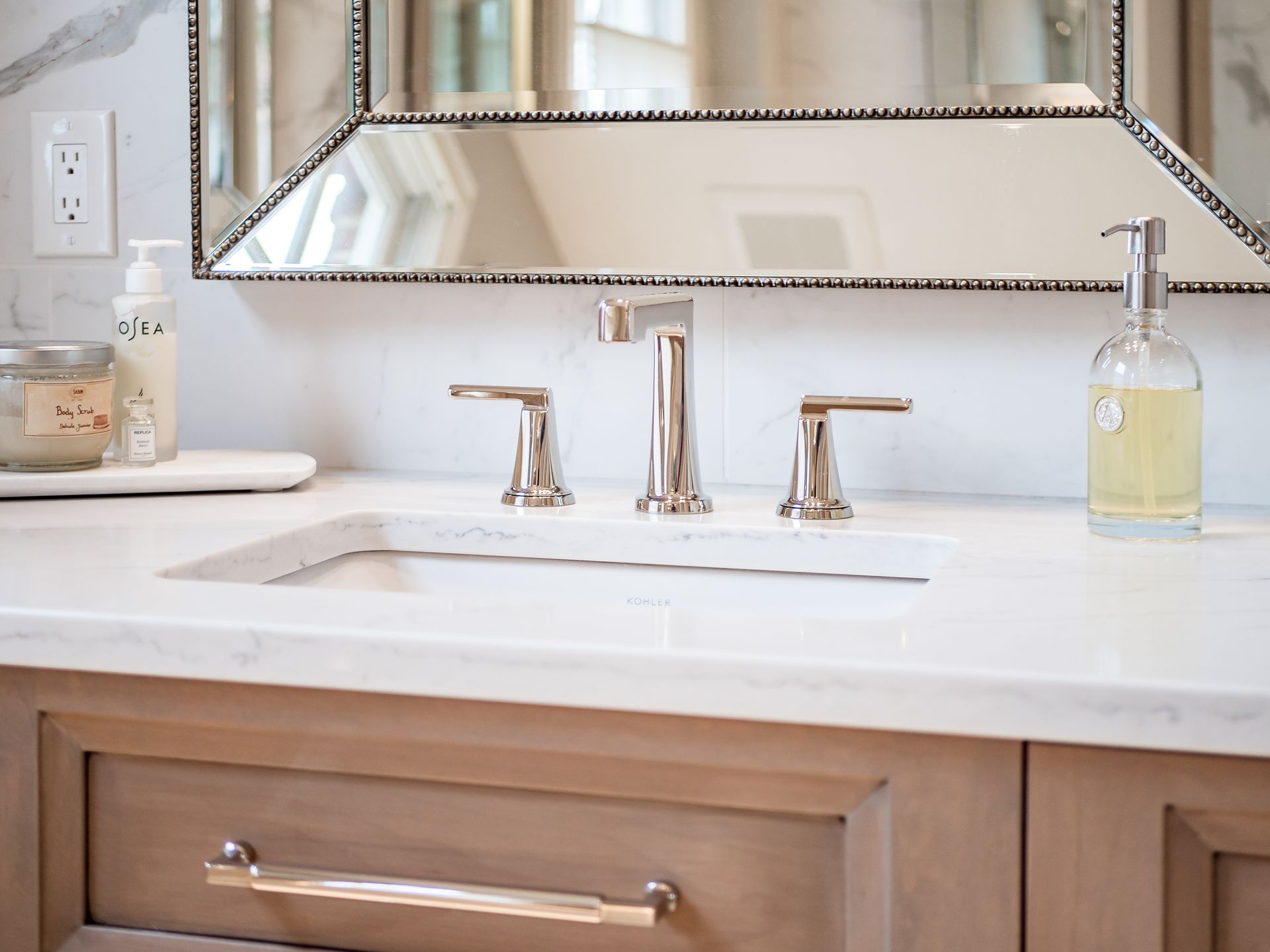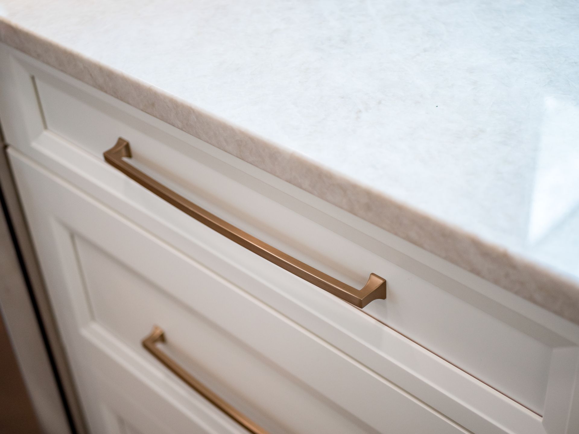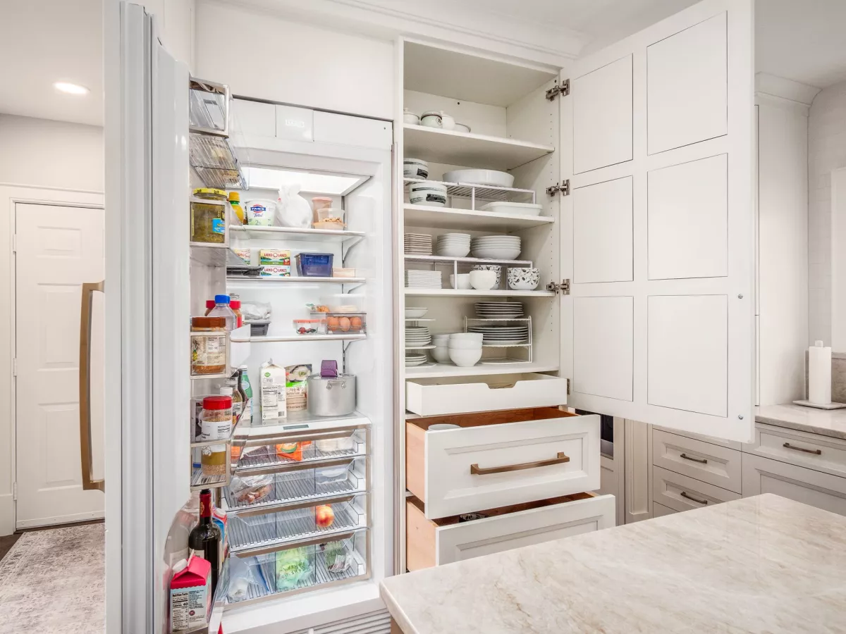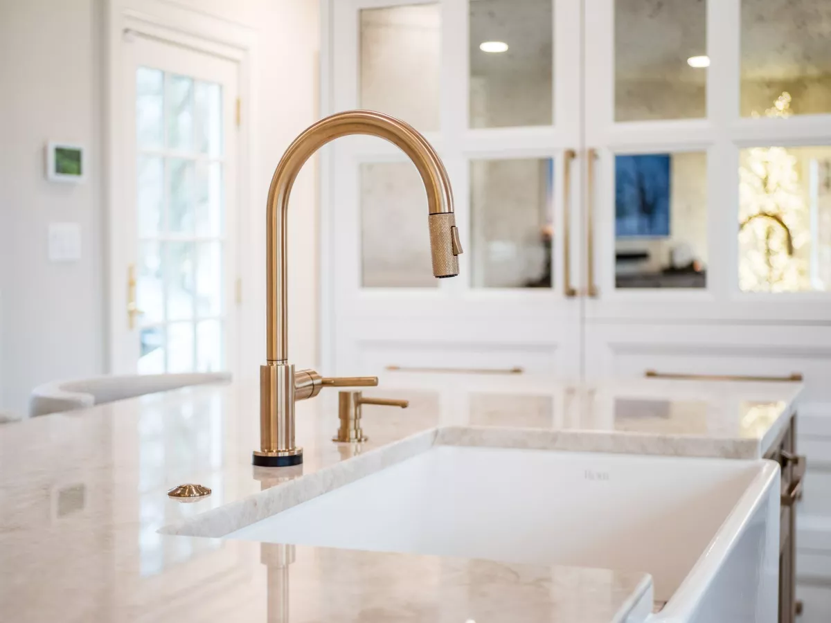 This stunning kitchen remodel showcases the perfect combination of luxury and functionality. At its heart are custom-crafted cabinets, designed to maximize storage while reflecting timeless sophistication. A striking custom hood with brass accents becomes the centerpiece of the kitchen, seamlessly tying together the aesthetic.