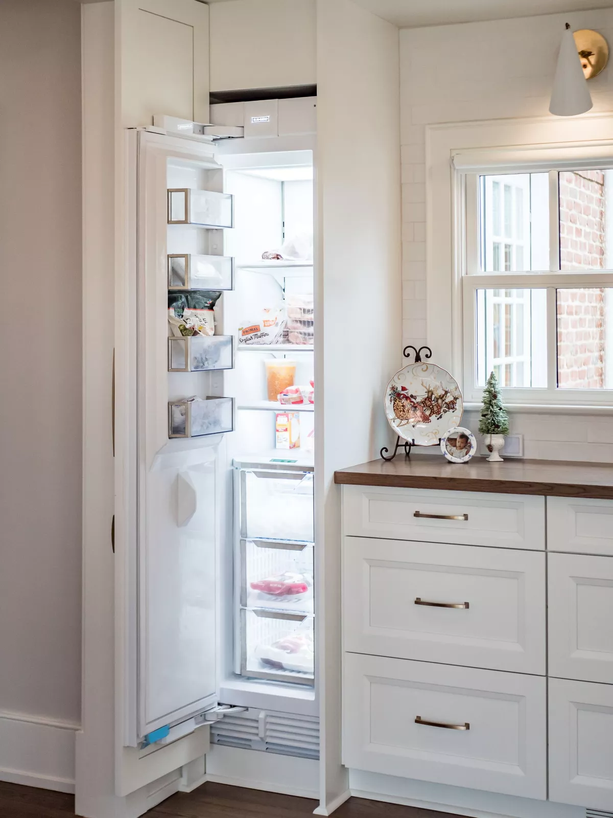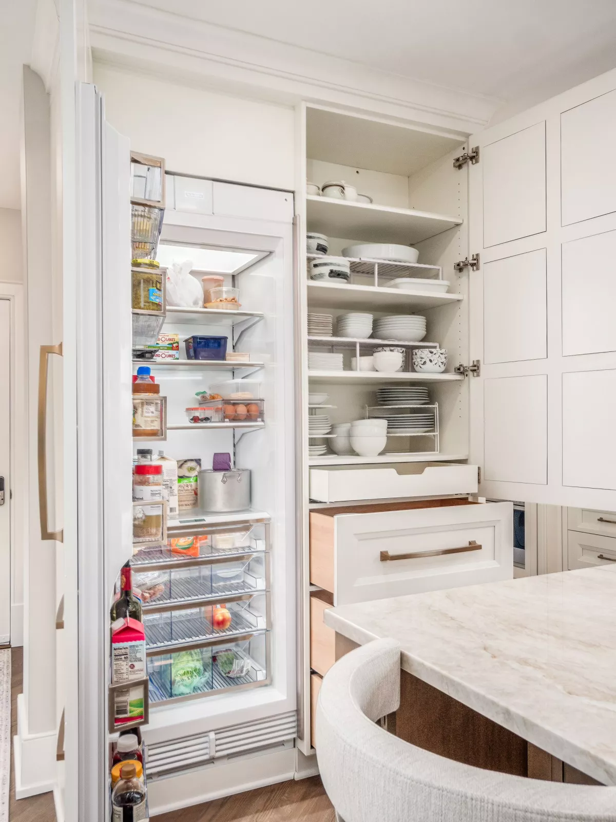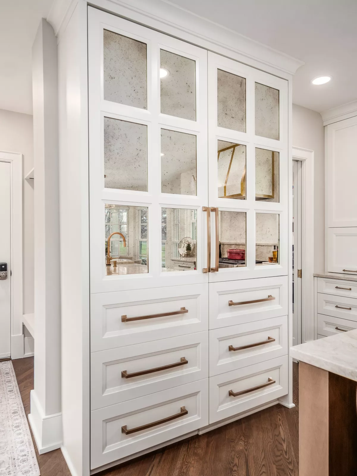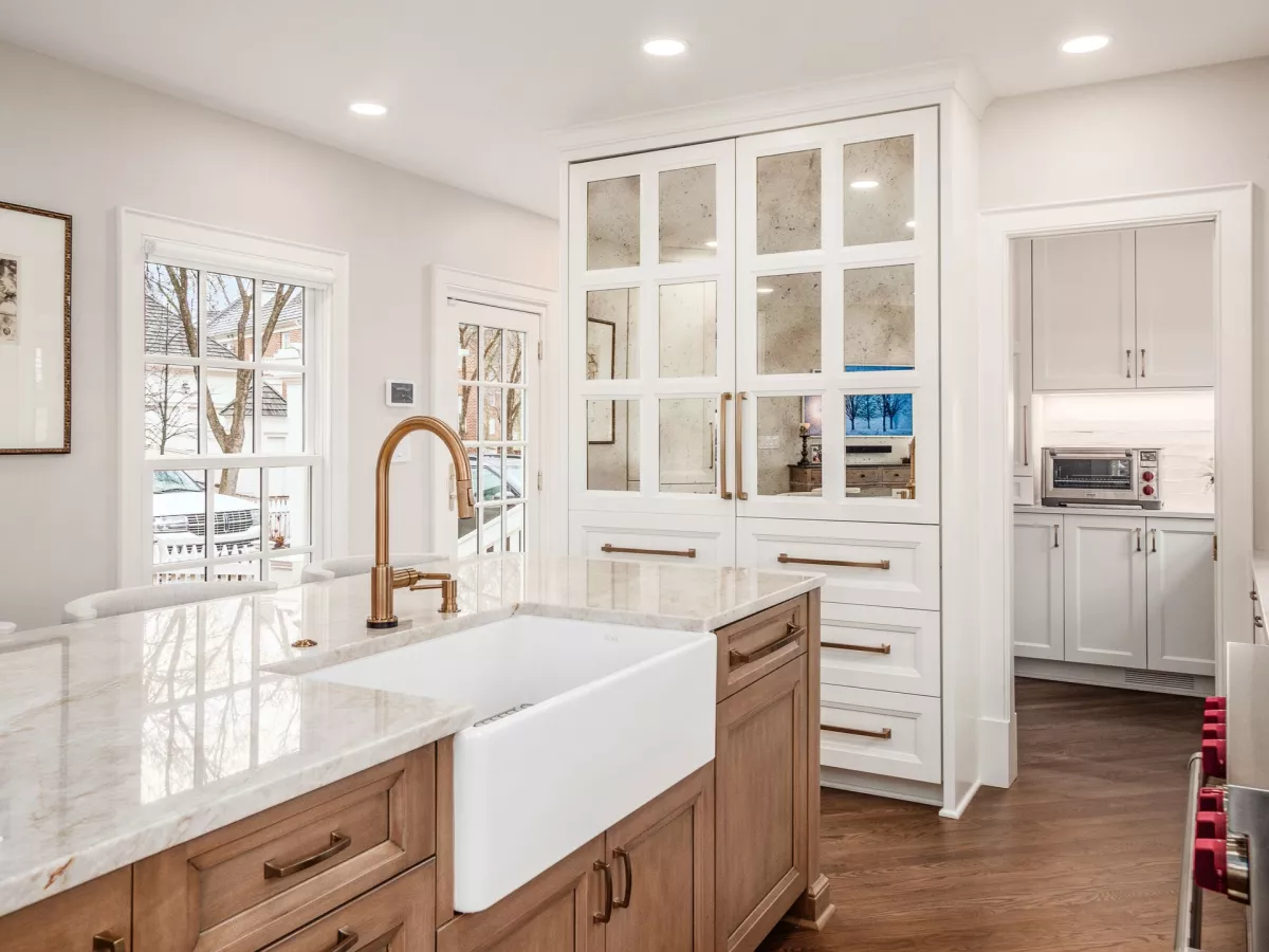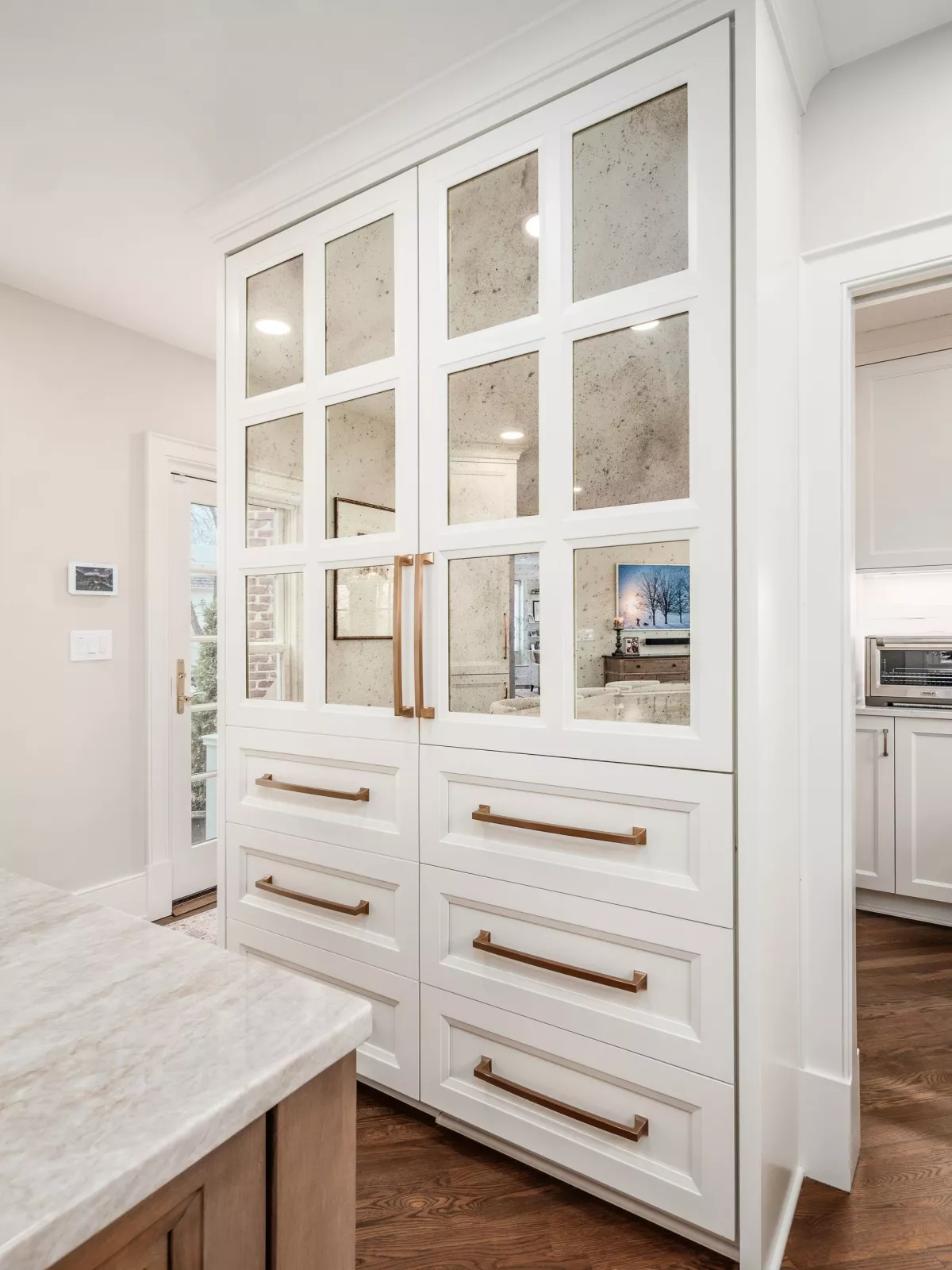 The design incorporates a hidden scullery, providing a discreet yet practical space for prep work and cleanup. Custom appliance fronts, featuring antique mirror inlays, elevate the design, blending practicality with an old-world charm.