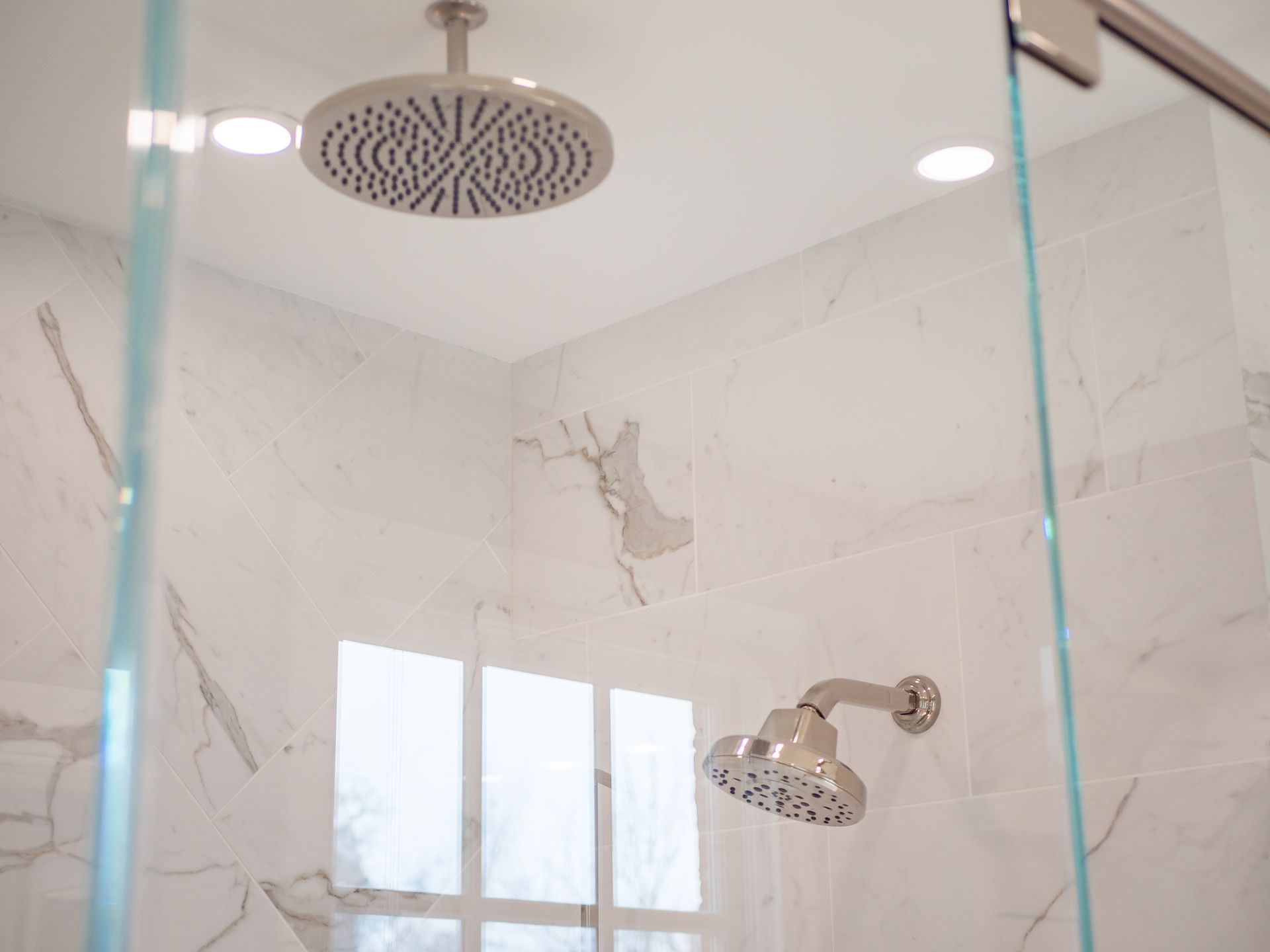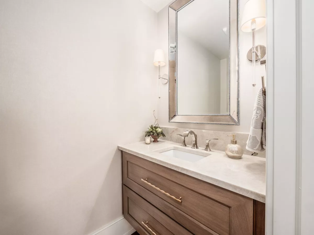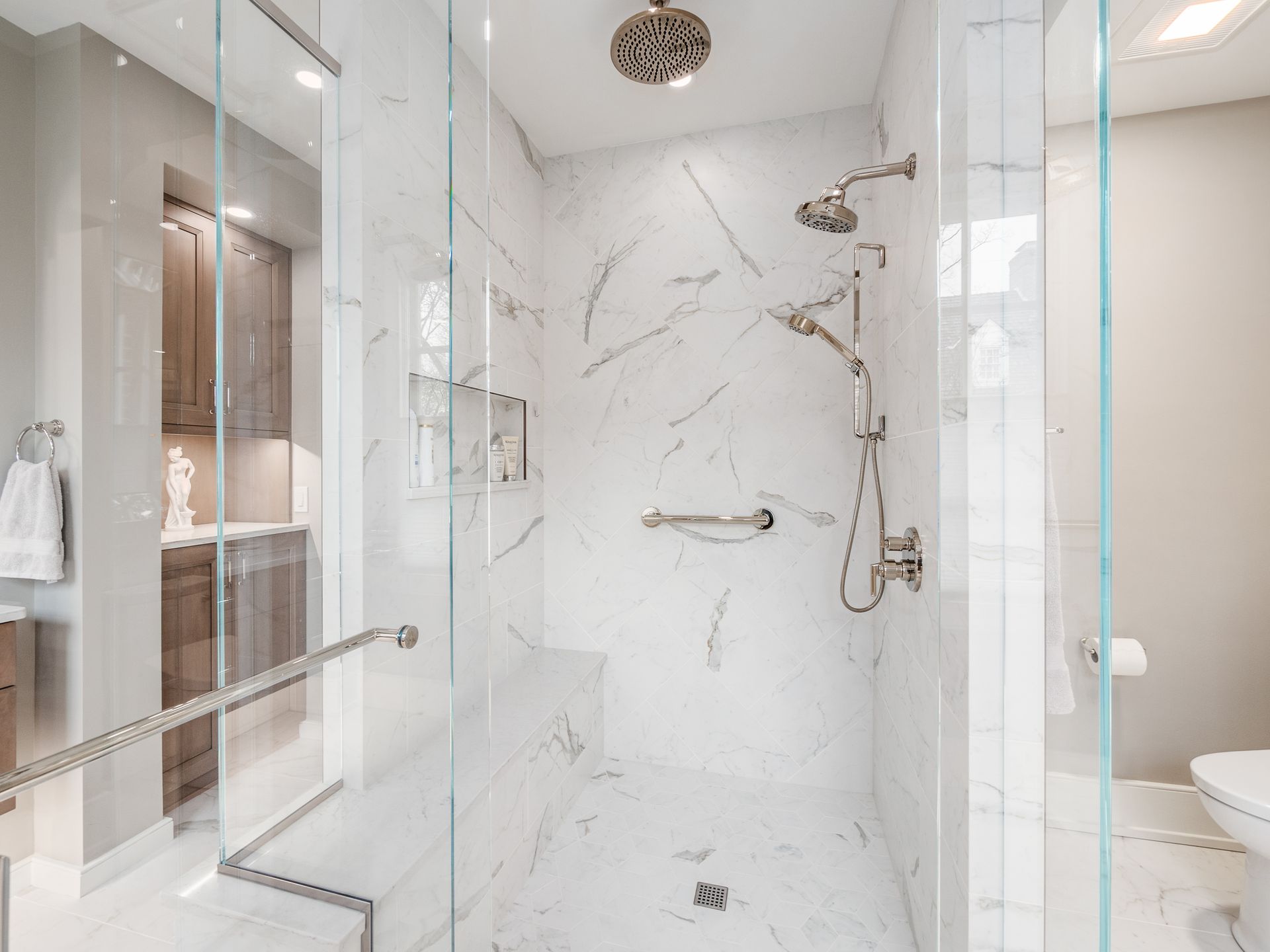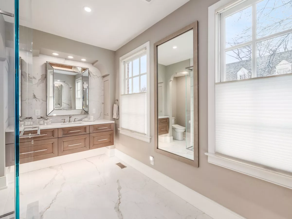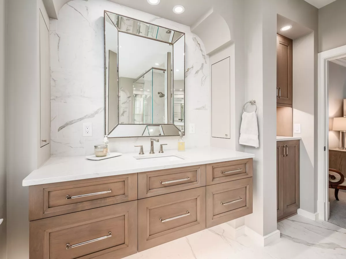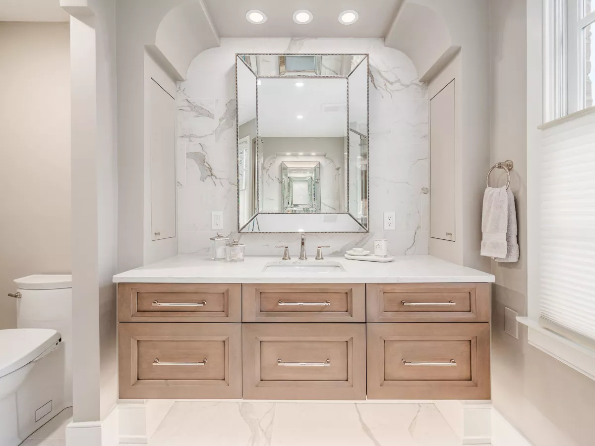 This upscale bathroom renovation is a masterpiece of modern luxury and timeless design. The centerpiece of the space is a pair of illuminated floating vanities, which appear to hover effortlessly, casting a warm glow that enhances the ambiance. Recessed, hidden medicine cabinets provide sleek functionality without disrupting the clean aesthetic. The spacious walk-in shower, with its seamless glass enclosure, showcases intricate custom tiling and high-end fixtures for a spa-like experience. Adding to the elegance are custom arched corbels, which lend architectural interest and a touch of classic charm. A unique feature of this bathroom is the built-in coffee bar, designed for ultimate convenience and indulgence. The walls are adorned with large-format tiles that create a sense of continuity and sophistication, perfectly complementing the premium cabinets and fixtures selected for the space. This bathroom is more than a renovation—it’s a thoughtfully crafted haven of comfort and style.