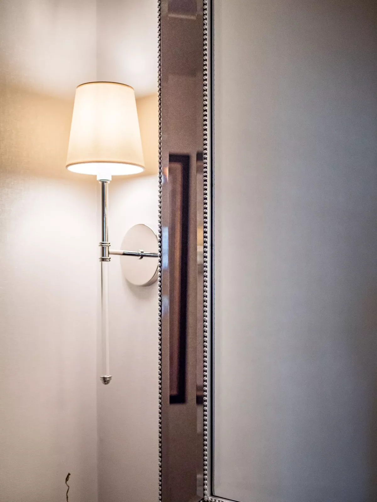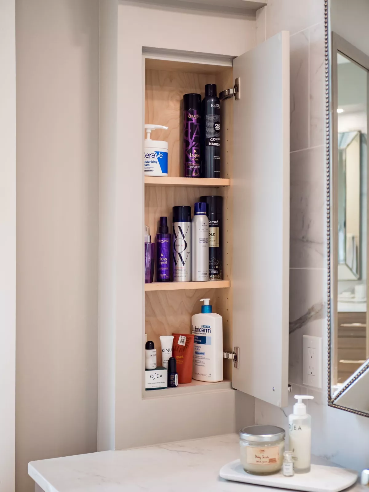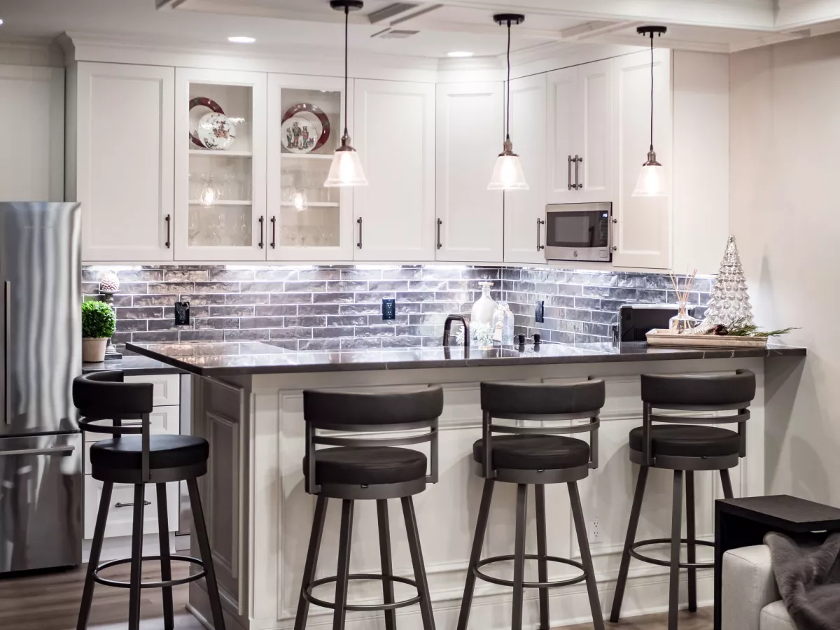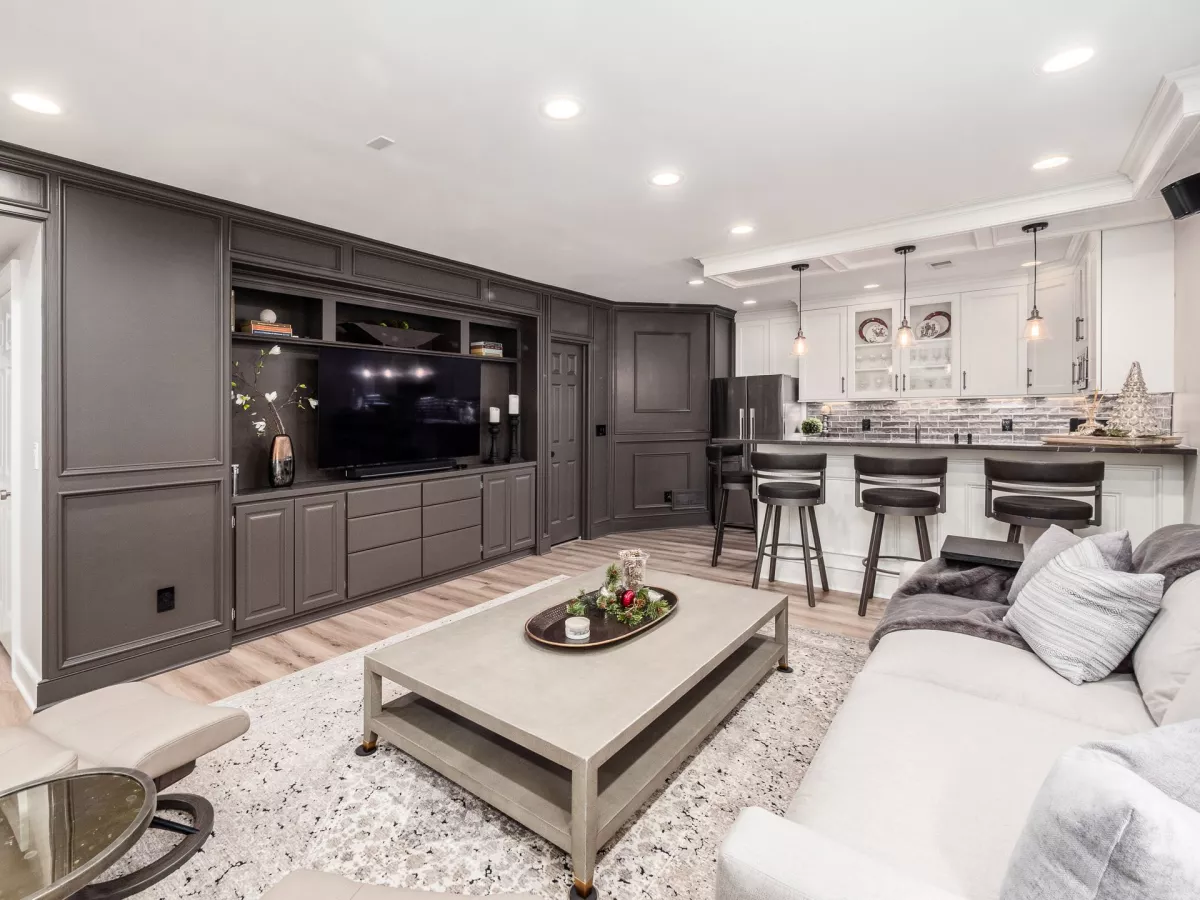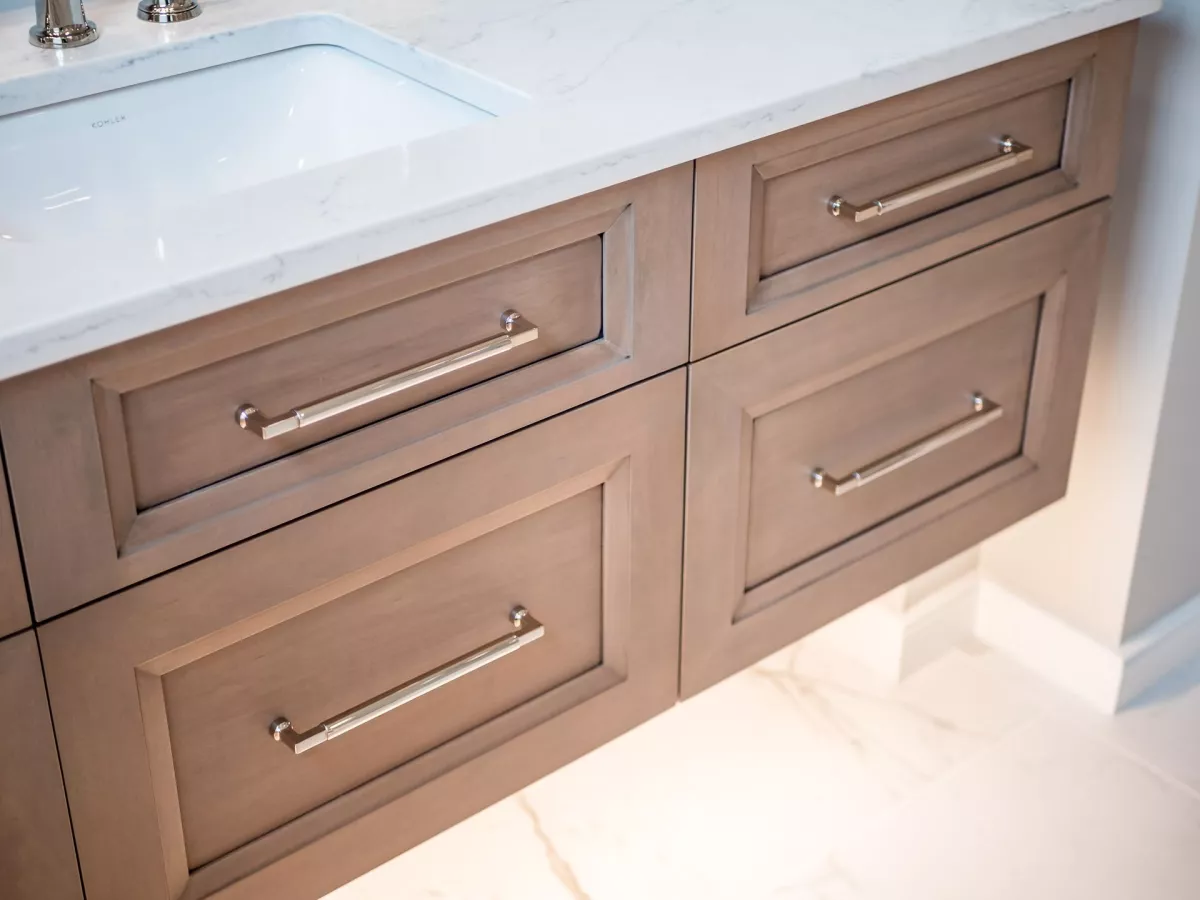 This upscale bathroom renovation is a masterpiece of modern luxury and timeless design. The centerpiece of the space is a pair of illuminated floating vanities, which appear to hover effortlessly, casting a warm glow that enhances the ambiance. Recessed, hidden medicine cabinets provide sleek functionality without disrupting the clean aesthetic. The spacious walk-in shower, with its seamless glass enclosure, showcases intricate custom tiling and high-end fixtures for a spa-like experience. Adding to the elegance are custom arched corbels, which lend architectural interest and a touch of classic charm. A unique feature of this bathroom is the built-in coffee bar, designed for ultimate convenience and indulgence. The walls are adorned with large-format tiles that create a sense of continuity and sophistication, perfectly complementing the premium cabinets and fixtures selected for the space. This bathroom is more than a renovation—it’s a thoughtfully crafted haven of comfort and style.