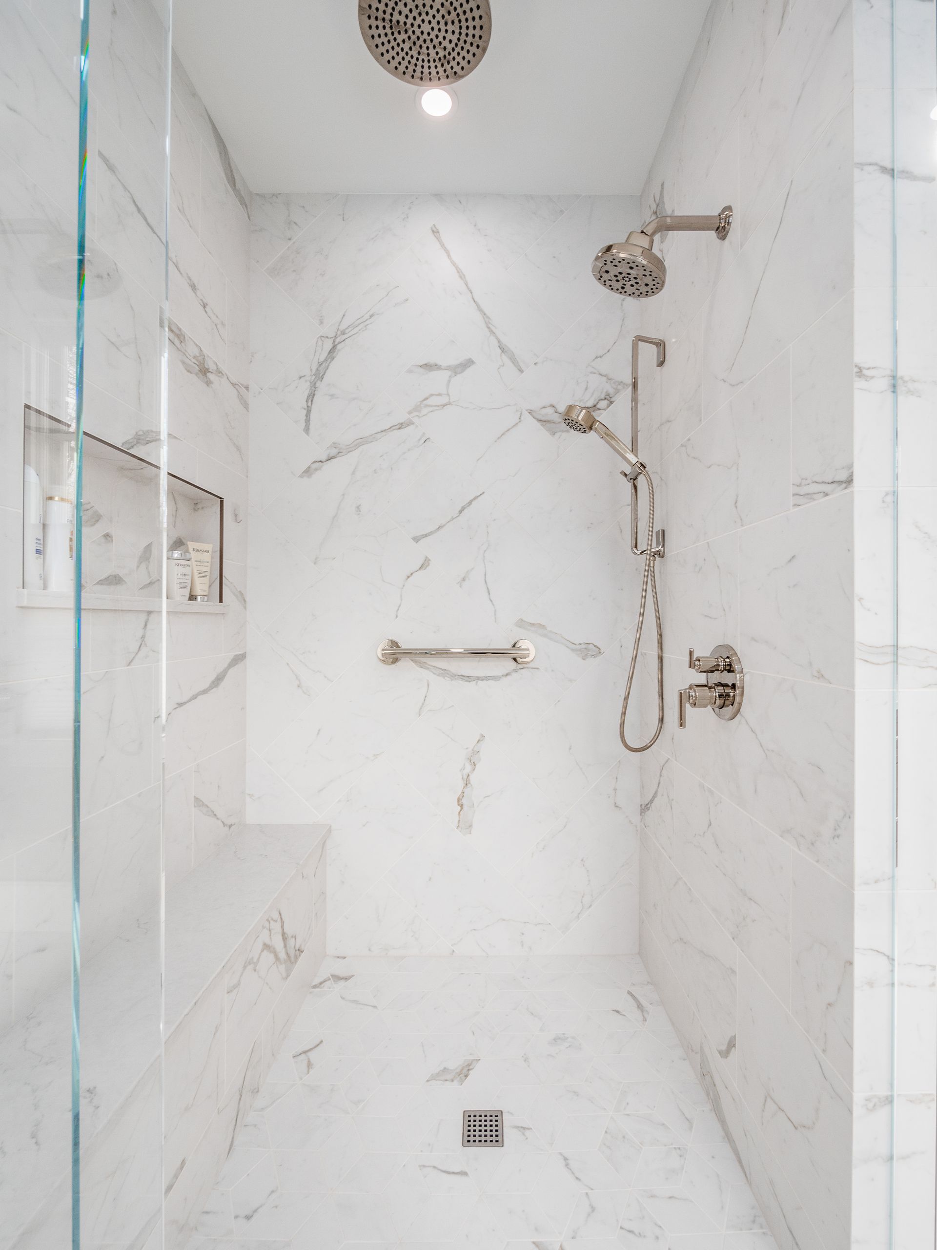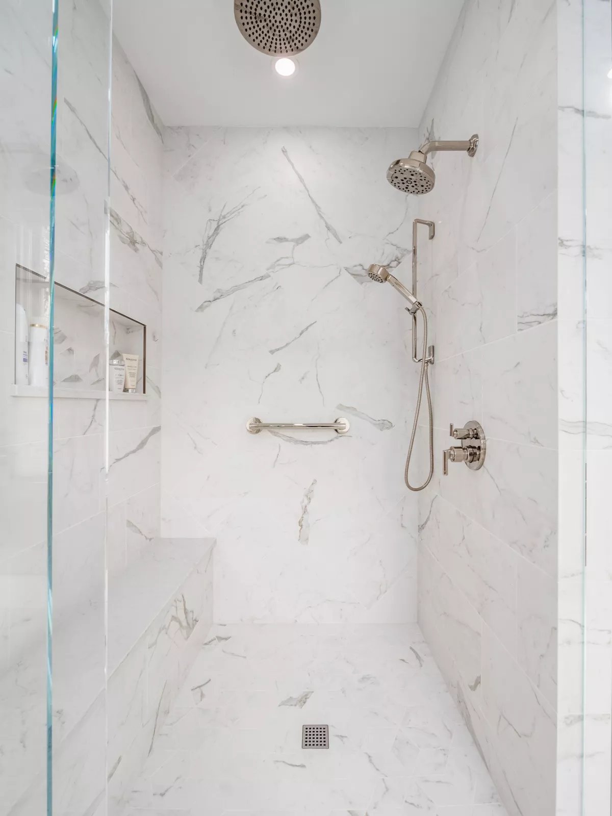 This bathroom is a true retreat—an oasis of luxury and tranquility. From the marble looking porcelain-clad walls to the custom double vanity and statement see-thru shower, every element was designed with elegance and relaxation in mind. The intricate tile work and high-end fixtures elevate the space, creating a spa-like experience at home. It’s a testament to how thoughtful design can transform a bathroom into a sanctuary. ~ Award Winning Designer-Jim Deen
