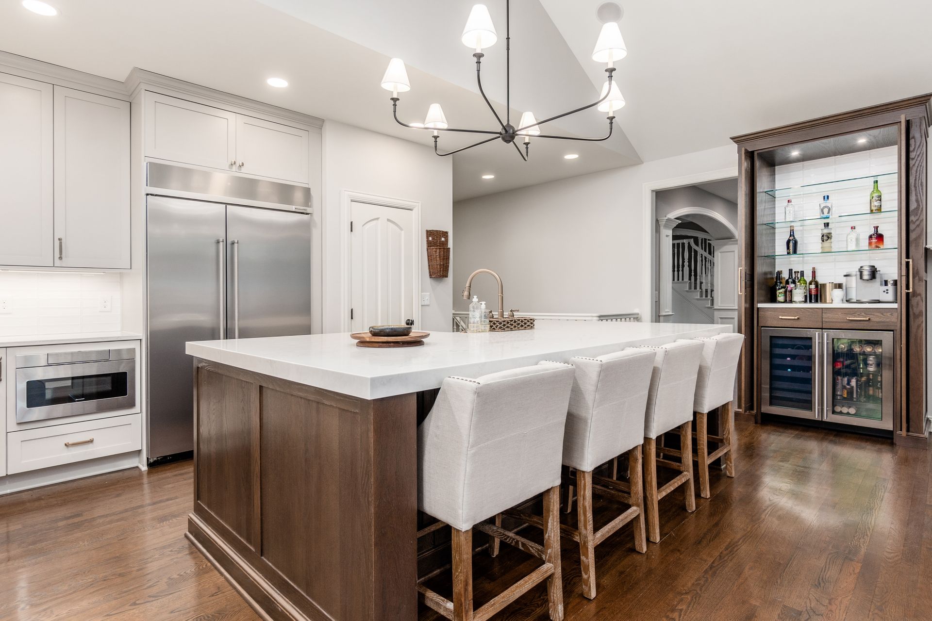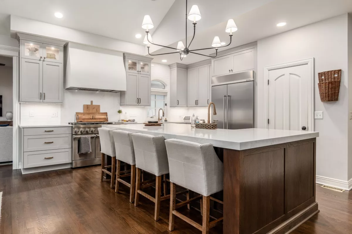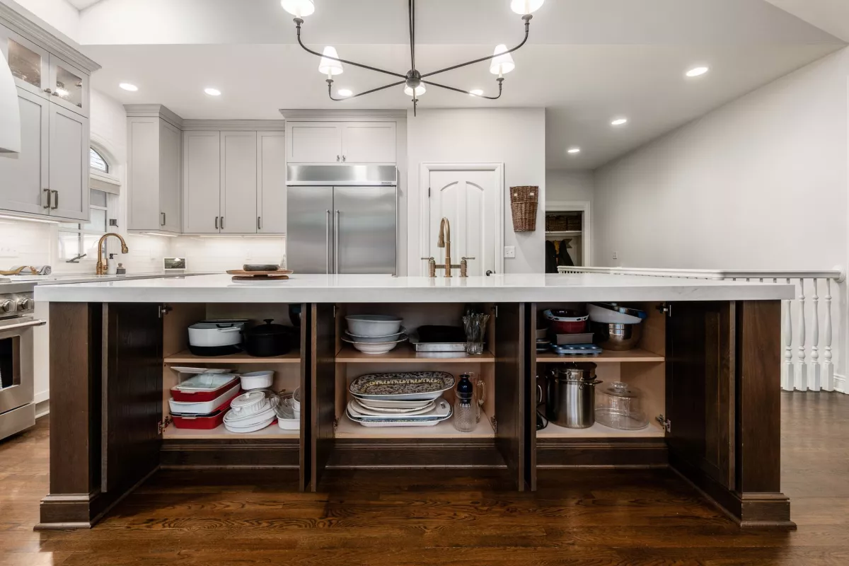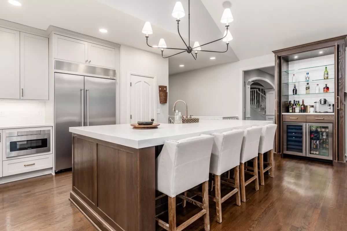 This kitchen remodel features a stunning blend of custom craftsmanship and modern design. We created beautiful, custom cabinetry that perfectly fits the space while providing ample storage and seamless functionality. One of the standout features is a hidden bar area, cleverly tucked away to maintain the kitchen’s clean, open feel while offering a private space for entertaining. The 10 foot island, topped with exquisite 6cm quartz counter tops, serves as both a statement piece and a highly functional work surface for cooking and gathering. To complete the look, a custom range hood was designed and made from plaster, adding a touch of elegance and balance to the space. The result is a kitchen that’s both beautiful and practical, perfectly tailored to the client’s needs and style.