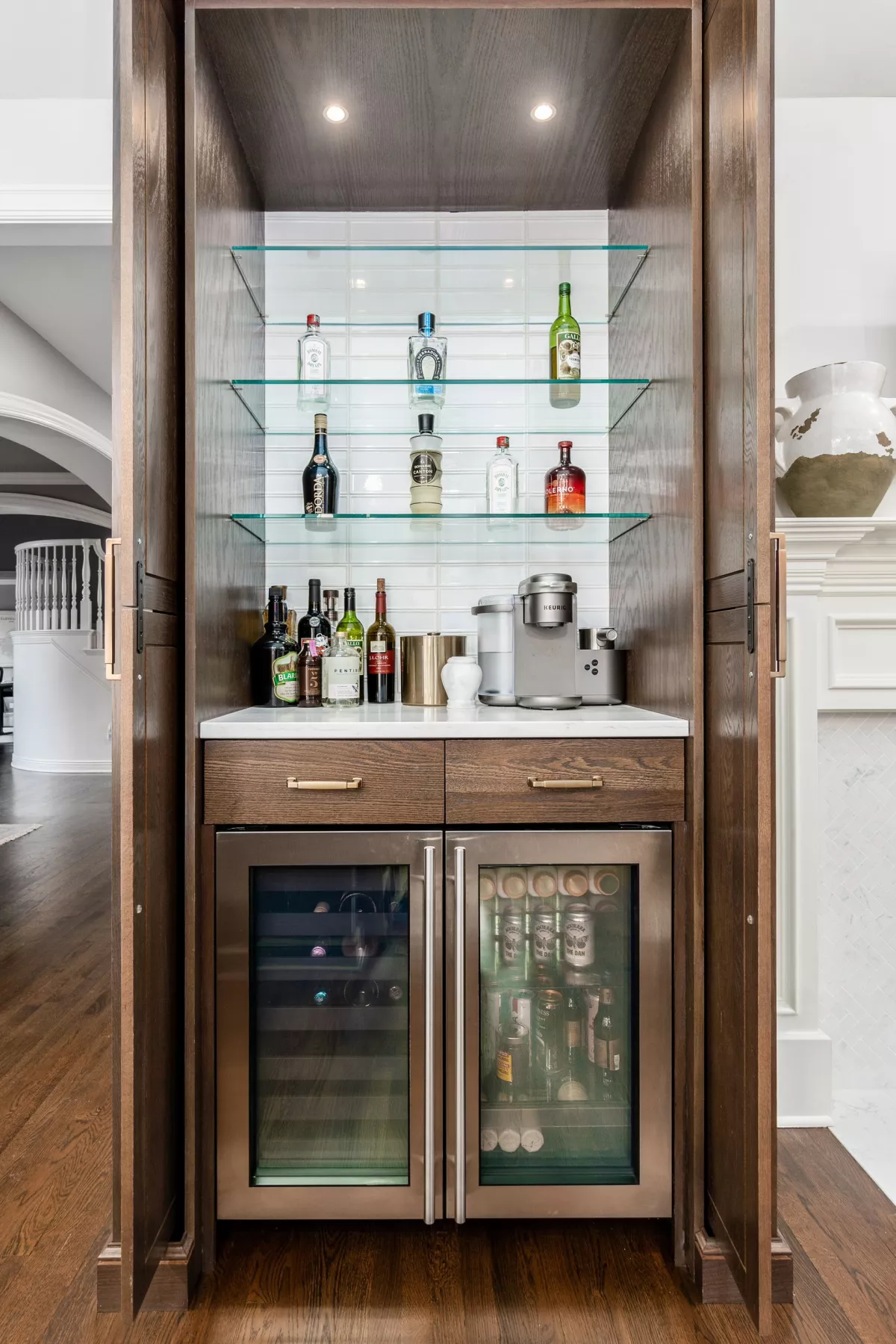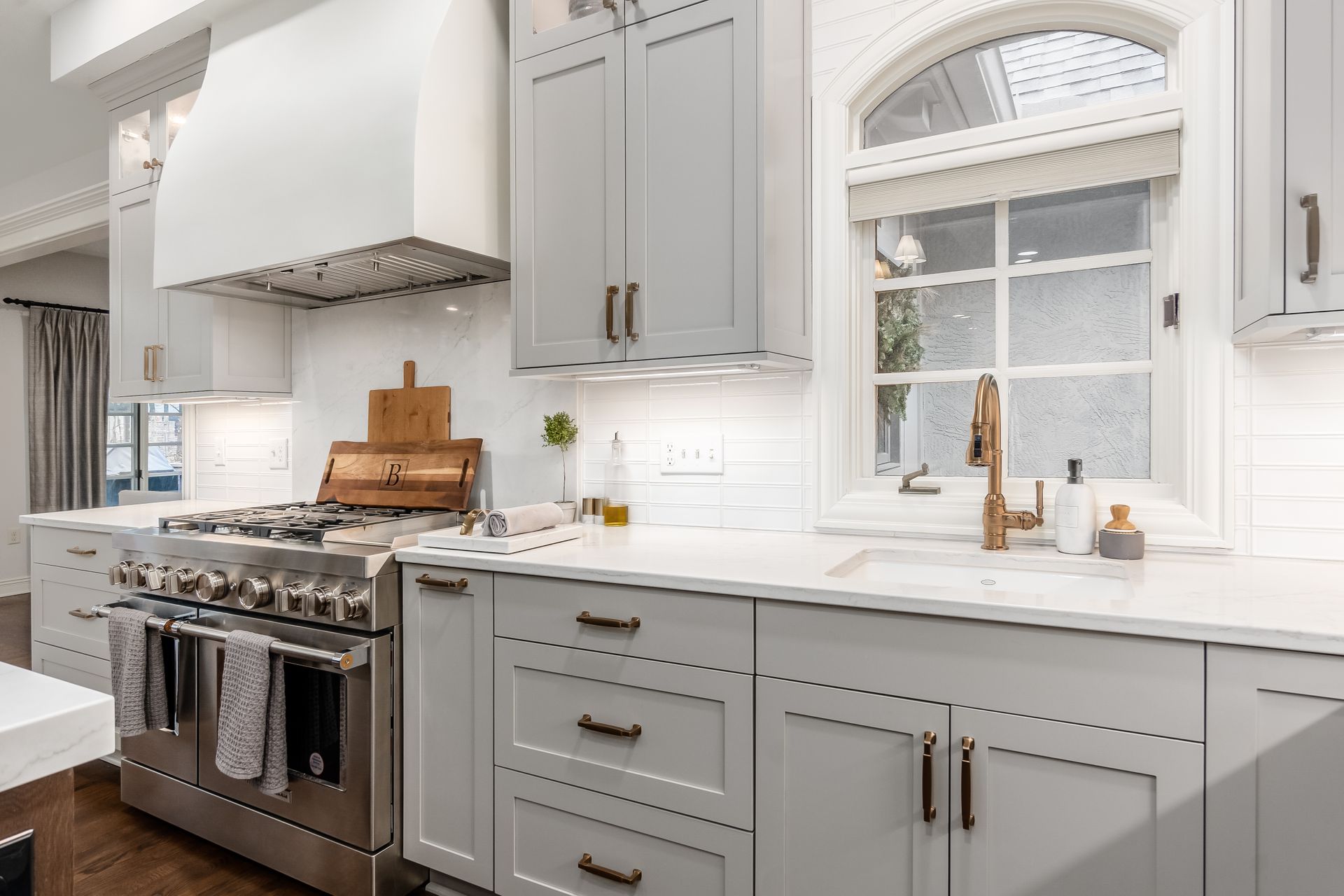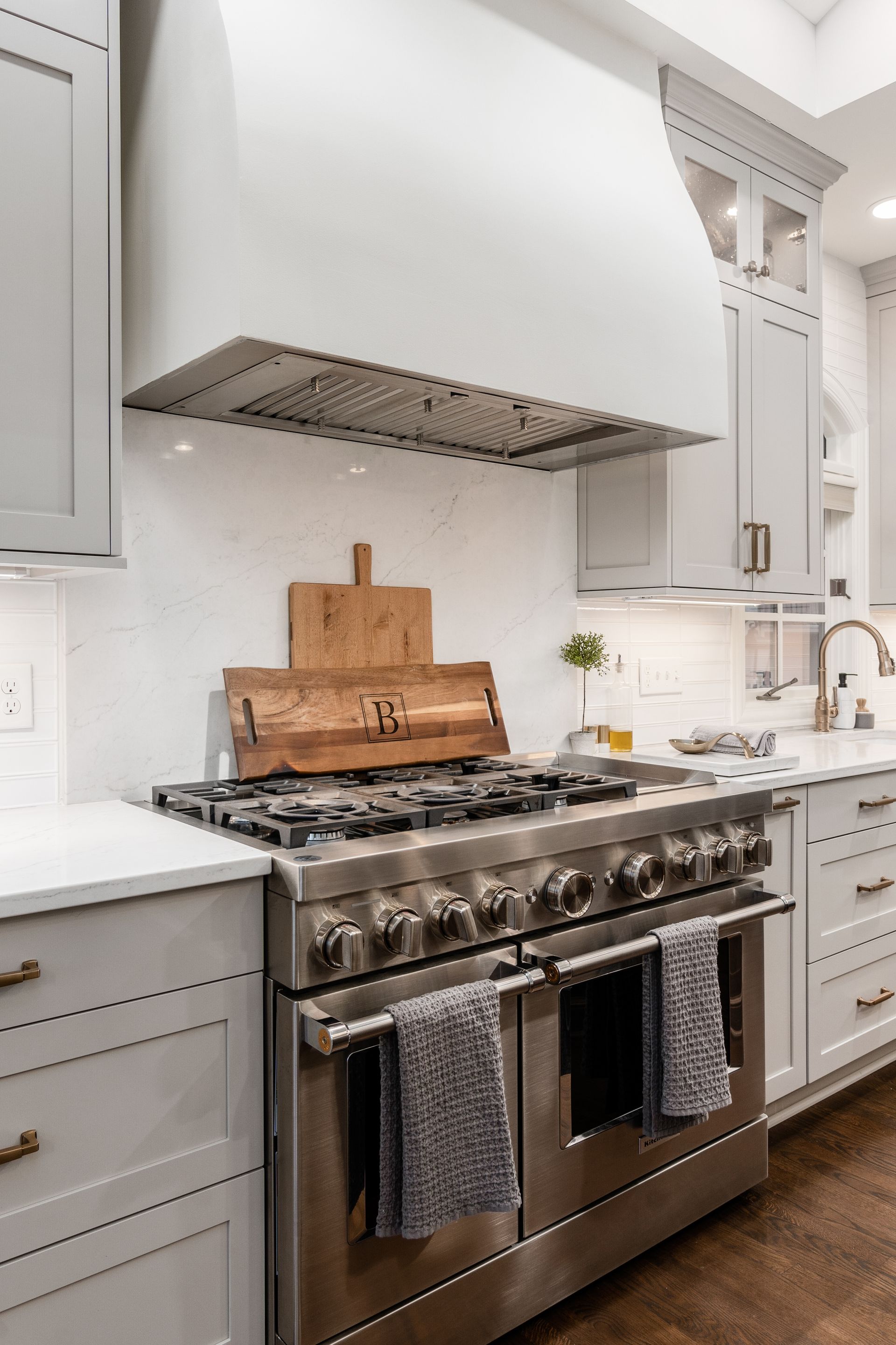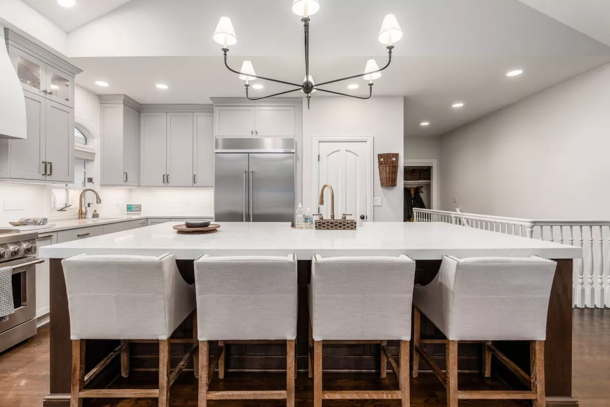 This kitchen remodel features a stunning blend of custom craftsmanship and modern design. We created beautiful, custom cabinetry that perfectly fits the space while providing ample storage and seamless functionality. One of the standout features is a hidden bar area, cleverly tucked away to maintain the kitchen’s clean, open feel while offering a private space for entertaining. The 10 foot island, topped with exquisite 6cm quartz counter tops, serves as both a statement piece and a highly functional work surface for cooking and gathering. To complete the look, a custom range hood was designed and made from plaster, adding a touch of elegance and balance to the space. The result is a kitchen that’s both beautiful and practical, perfectly tailored to the client’s needs and style.