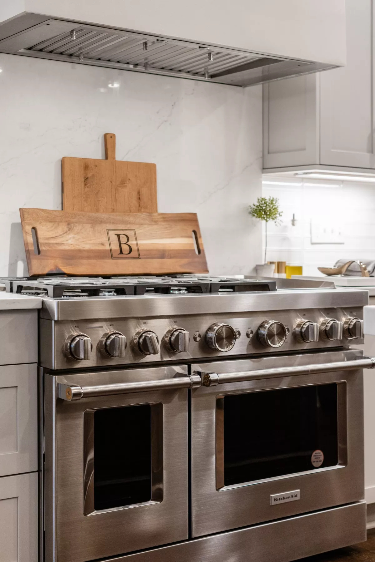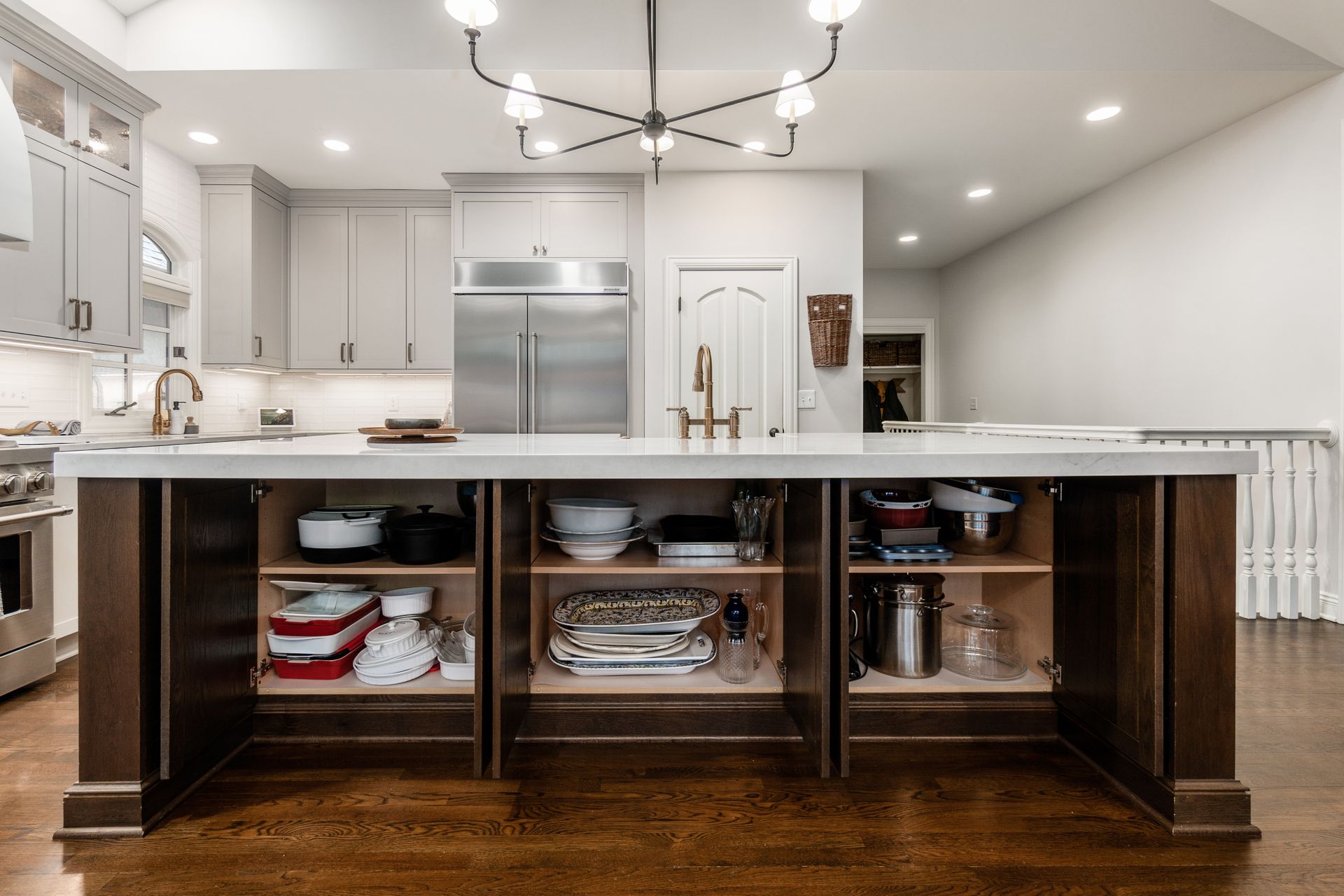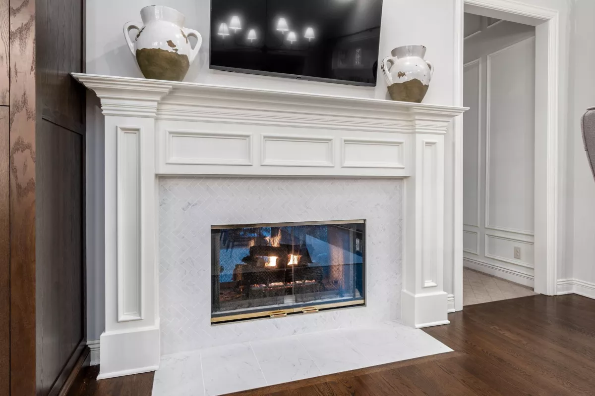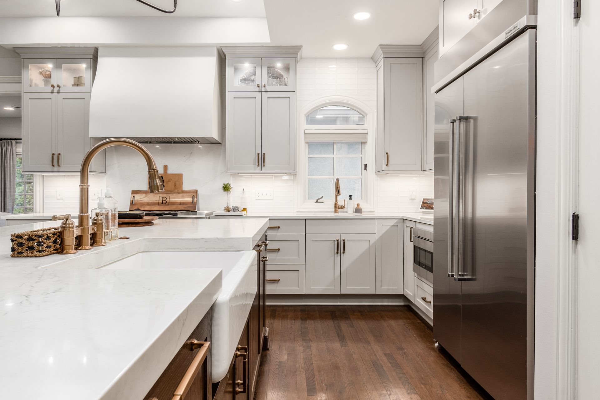 This kitchen remodel features a stunning blend of custom craftsmanship and modern design. We created beautiful, custom cabinetry that perfectly fits the space while providing ample storage and seamless functionality. One of the standout features is a hidden bar area, cleverly tucked away to maintain the kitchen’s clean, open feel while offering a private space for entertaining. The 10 foot island, topped with exquisite 6cm quartz counter tops, serves as both a statement piece and a highly functional work surface for cooking and gathering. To complete the look, a custom range hood was designed and made from plaster, adding a touch of elegance and balance to the space. The result is a kitchen that’s both beautiful and practical, perfectly tailored to the client’s needs and style.